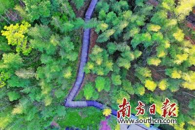 氣勢浩然的竹海、竹材搭建的棧道在朝陽下交織,繪成一幅優(yōu)美的冬日畫卷。丘林強 攝